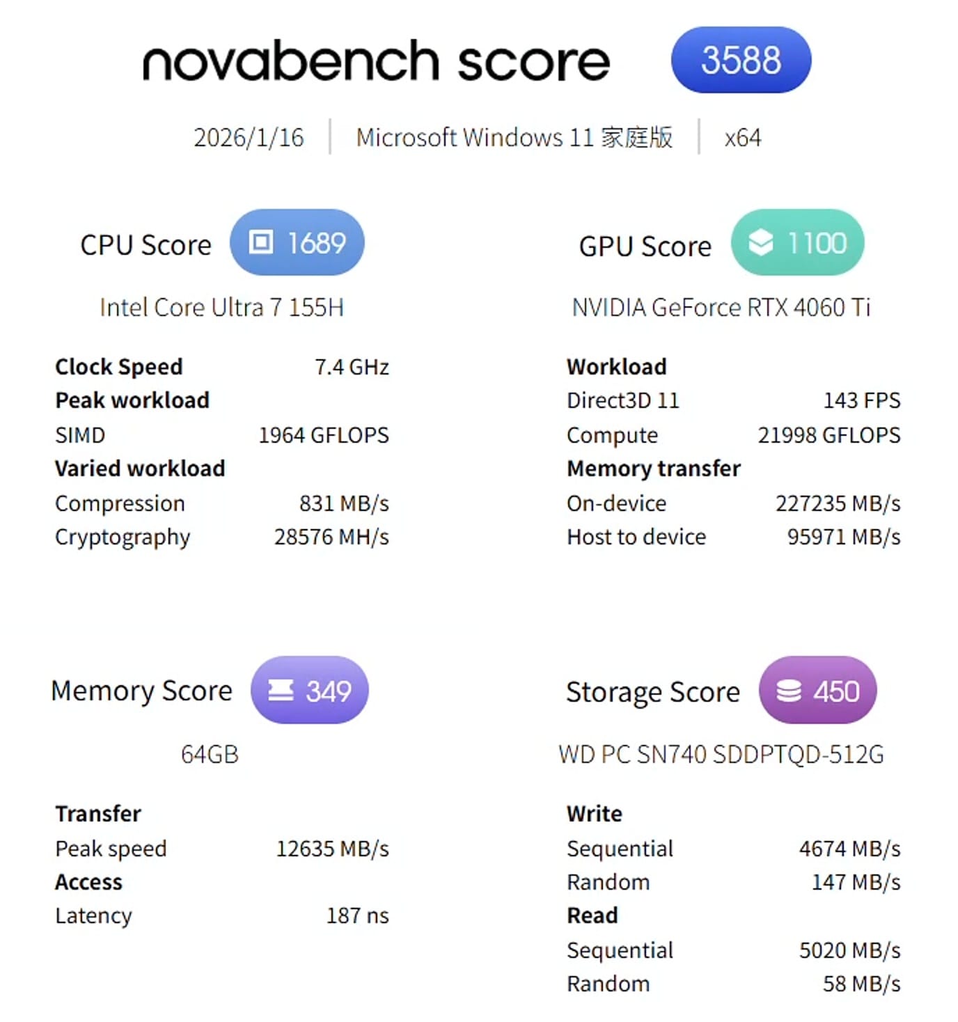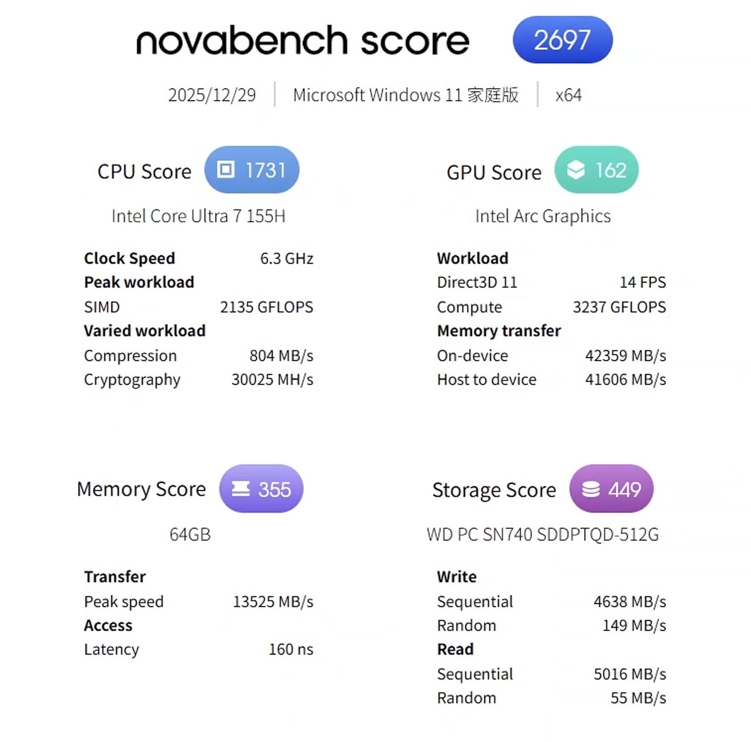 忽略显卡评分,在 CPU 评分上,这样的分差如预期般的体现了桌面级和移动级的差距。但内存和存储上的差距却着实没有预期的那么大。