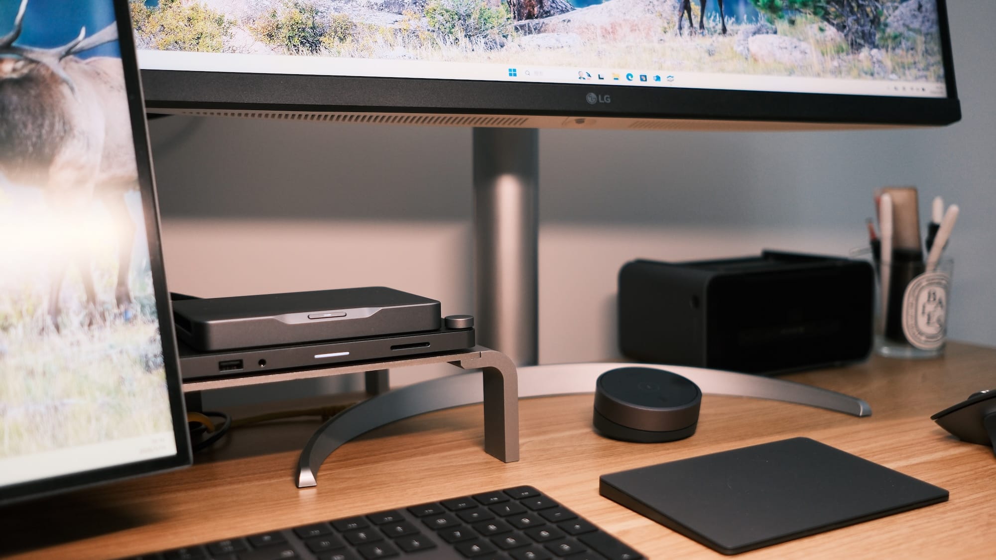 就算加上 Mind Dock,可以轻松塞进桌面大部分位置,我最喜欢把它放在显示器架子上,不浪费桌面上任何一点空间,但是仍然很方便操作,不管是指纹按钮还是音量滚轮都能轻松触及。