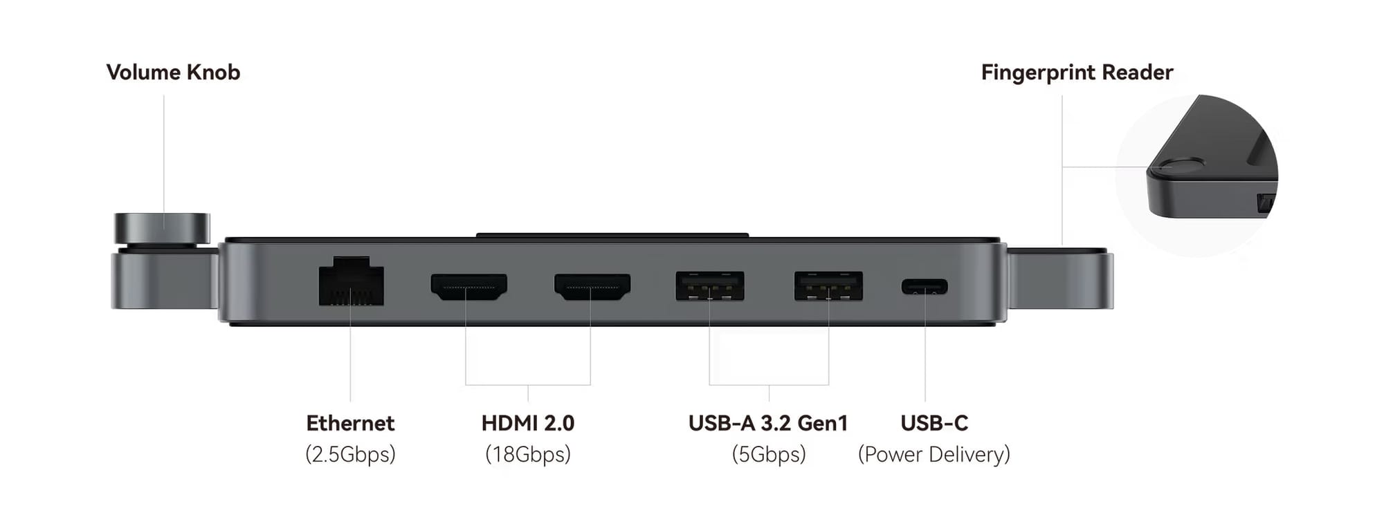 Mind Dock 是多功能底座扩展坞,侧重于为 Mind 2 主机提供各种接口,提升连通性和功能。其中包括2.5Gbps 以太网口、多个 USB 3.2 Gen1 接口、HDMI 2.0、SD 读卡器、3.5 毫米耳机孔,甚至还有指纹识别模块和音量旋钮。